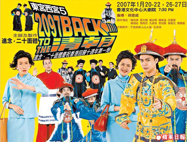 為回歸10周年贈興,進念二十面體原班人馬炮製《2097Backtothe清朝》。以80年代史提芬史匹堡監製的科幻經典《BacktotheFuture》為藍本,故事發生於2097年7月1日的西九龍文娛藝術區娛樂大劇院。經90年爭議,西九終趕及香港回歸百年晚會當天開幕,玩盡特首007之BowTie曾大破手袋黨、英女皇的教室之陳太見步行步八重奏、一公升眼淚之一百張選票……回到未來展望過去,又回到過去展望未來,展示時間沒有錯對政治正確觀念。