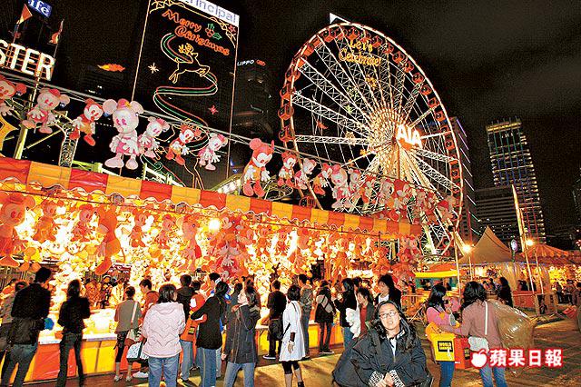 酒吧餐廳林立的中環蘭桂坊,情侶或好友吃着喝着等新年。今年元旦倒數,中區還有一個新蒲點,就是添馬艦環球嘉年華,在機動遊戲場上跨越新年。此外,維園工展會的「除夕歡聚大巡遊」也吸引了不少市民參加,現場有超過300人的巡遊隊伍。