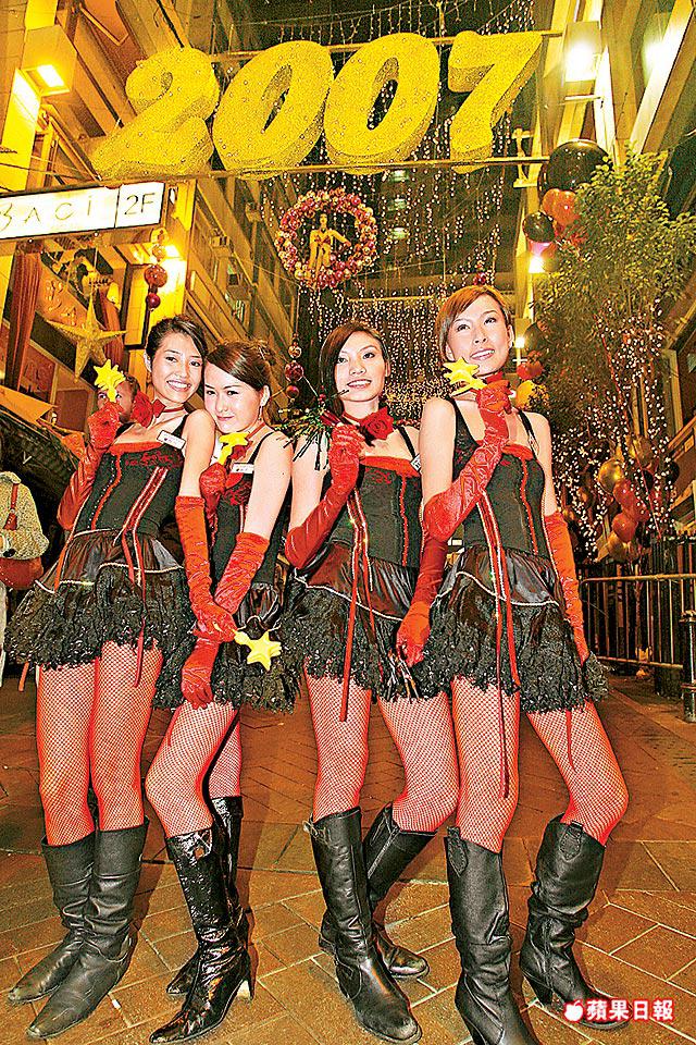 同在尖沙嘴的海港城則以「首個以維港做背景的倒數派對」作標榜,吸引市民前往海運大廈睇騷迎新年。不過論氣氛,始終不及臨時劃作行人專區的廣東道。入夜之後,打扮騎呢的旅客、衣着性感的女士,還有手持氣球蹦蹦跳的小孩子,紛紛走在街上。