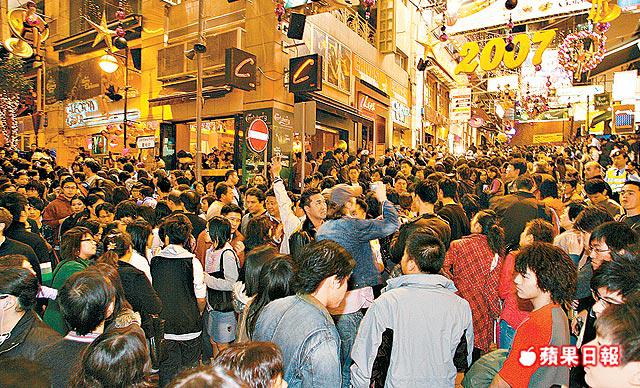人太多了,遊人連拍照也有困難,因為鏡頭前總有人來往穿插。海港城開闢了一個攝影區,以鐵馬隔開人群,讓人可以有個私人空間拍攝留念。倒數過後,滿街依然是狂歡的人群,直至凌晨1時過後,人潮才逐漸散去。