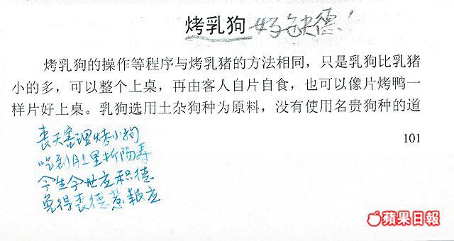 【本報訊】燒乳豬吃得多,原來有一味菜式叫「烤乳狗」!想知怎樣做這道菜,只要到香港中央圖書館,便可借到有教「烤乳狗」的烹調書。繼香港新華書城被揭所售賣的內地食譜有教烹調狗肉菜式後,康樂及文化事務署轄下的公共圖書館也有同類書籍。康文署已暫停借閱該批烹飪書,有立法會議員批評署方疏忽。記者:倪清江 盧文烈