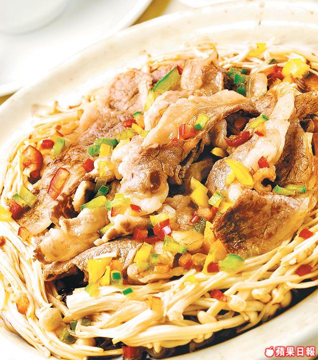 材料﹕金菇200克、肥牛1/2磅、粉絲適量、玫瑰露酒1湯匙、花雕紹酒2湯匙、雙蒸200毫升、沙嗲醬2茶匙、辣椒油2茶匙、指天椒1両、糖2茶匙、鹽1茶匙、雞粉2茶匙、水300毫升