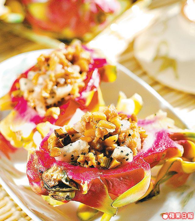 材料︰雞扒150克、火龍果1個、松子2湯匙、蒜茸/薑茸各1/2茶匙、青豆/洋葱碎/西芹粒/紅蘿蔔粒各適量、鹽少許