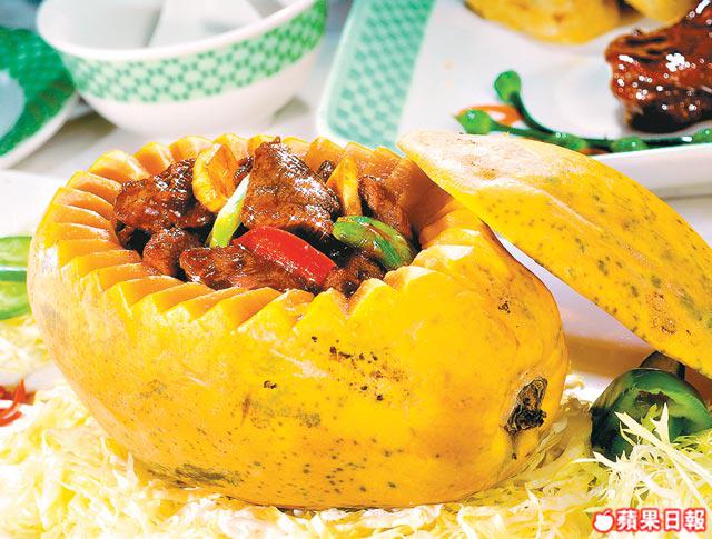 做法:慢火炸牛仔柳,將熟時加木瓜肉猛火略炒。隔油後加蒜片、上湯及調味慢火煮,埋生粉芡收亁水,最後放入木瓜內即可。