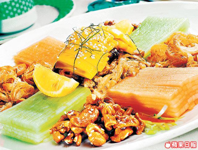 材料:油條1/2條(切薄片)、合桃3両(用糖膠炸後撒芝麻)、哈密瓜/蜜瓜肉各1磅(切條)、芒果1/2個(切絲)、海蜇/火鴨絲各2両、檸檬汁少許