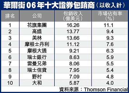 隨着美股暢旺、借貸成本仍屬偏低,再加上併購活動頻仍,華爾街在06年的證券包銷額超越7萬億美元,打破歷年來紀錄。花旗集團成為最大贏家,包銷收入超過16億美元,佔全行總收入逾一成。