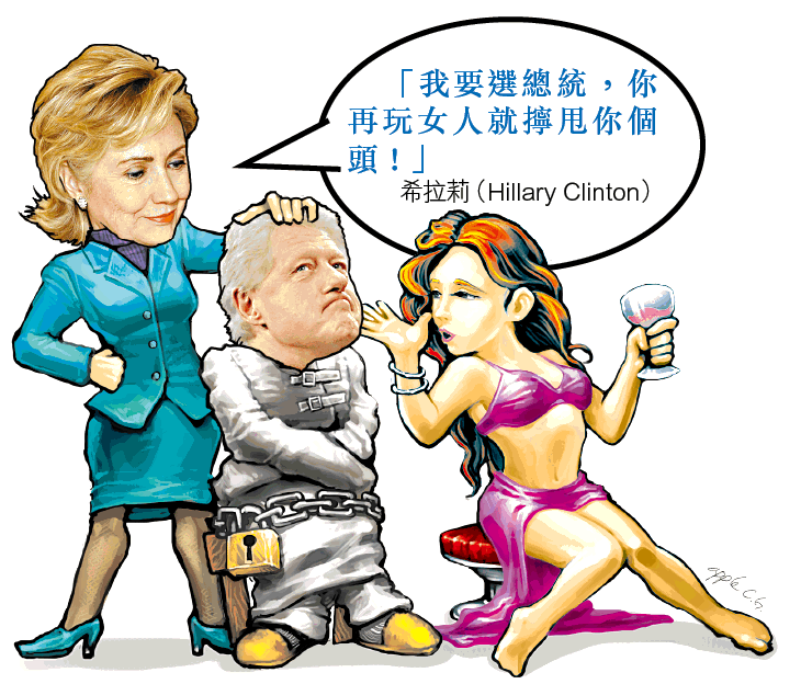 她做美國第一夫人時,總統丈夫克林頓用雪茄情挑白宮肥妹見習生萊溫斯基,東窗事發,她憤怒得想揑斷他的脖子。她今年蓄勢參選總統,找來民主黨一流競選戰將助陣,誓要做美國首位女總統,有傳她已跟不忠丈夫約法三章,他若再拈花惹草偷情拖累她的選情,就要公開道歉和離婚,還要賠償她數以百萬美元。