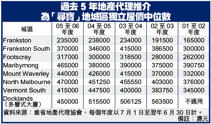 有意入市的首次置業者,可能認為今年樓價仍趨升是壞消息,不過,他們若肯到距離市中心較遠,而又具升值潛力的城區「尋寶」,仍不乏投資置業機會。一條連接墨市南部城區至東面城區的高速公路幹線Mitcham-FrankstonEastLink將於2008年通車,屆時由南部到東部,原來需一小時的車程,將大幅縮短至約20分鐘。地產代理HockingStaurt(Frankston區)董事AndrewGillespie預期,在高速幹線通車後,保守估計該區的樓價會上升20%,目前該區一些較舊的兩房房屋,叫價約30萬元。