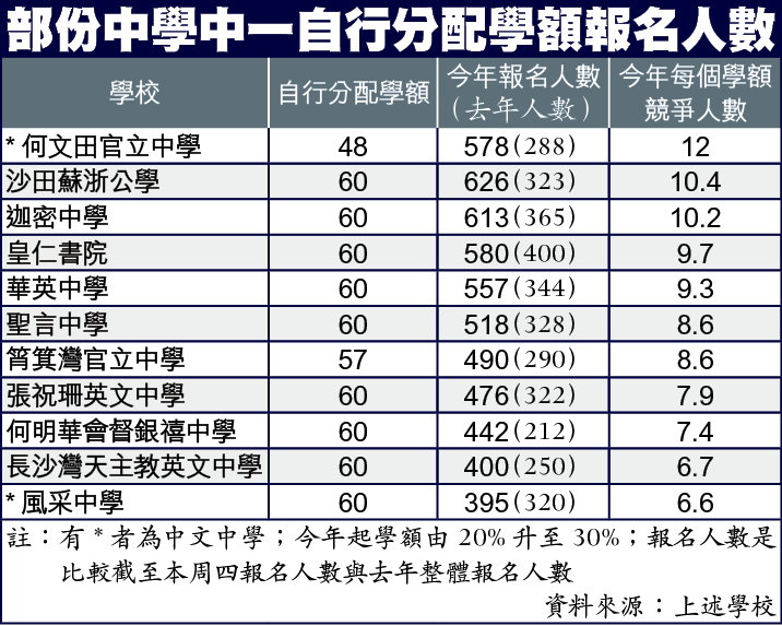 【本報訊】本年度中一自行分配學位將於下周一截止報名,由於今年自行分配學額由佔中一總學額20%擴至30%、每名學生可報讀中學由1間增至2間,著名英文中學和中文中學的報名人數都大升,有中中報名人數升近1倍,每1學額比去年多3人爭讀,競爭比往年更激烈。