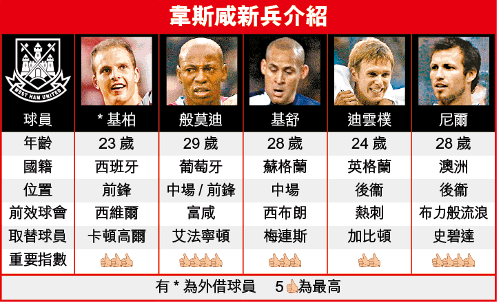 此外,有傳韋斯咸將以1,700萬鎊(約2.6億港元)由查爾頓簽入前鋒戴倫賓特加強攻力,以及動用800萬鎊從英冠伯明翰羅致後衞厄遜;如消息屬實,屆時韋斯咸班底必更為龐大,護級機會大增。文:畢傑