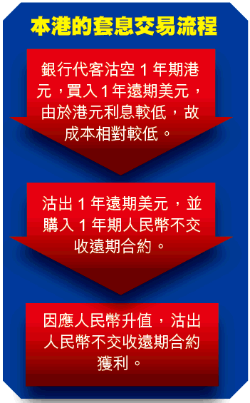 方法是銀行首先代客買入一年遠期美元並拋空同年期的港元,同時沽出1年遠期美元並「掃入」1年不交收遠期人民幣,結果等於拋空1年遠期港元而購入1年不交收遠期人民幣。