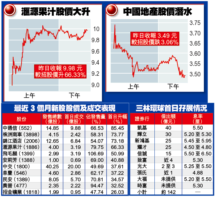 新股首日暴升盛況再現。全國最大橙汁集團滙源果汁(1886)昨日掛牌,曾高見10.06元,較招股價6元升67.67%,收報9.98元,逆市升66.33%,為去年12月20日上市的株州南車(3898)以來,升幅最大新股。反觀同日掛牌,以下限3.6元定價的中國地產(1838),僅在首20分鐘保持於「水面」,最後仍跌穿招股價收市。繼1月上市的台一國際(1808)後,第二隻首日潛水新股。