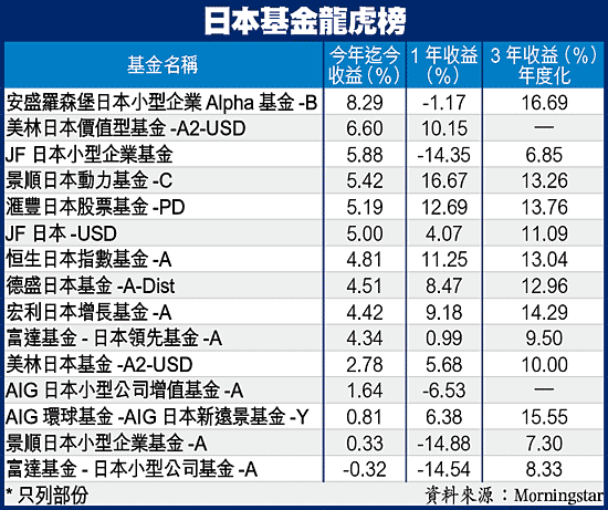 追蹤細價股的日本Mothers指數去年暴跌56%(截至本月23日的12個月跌33%),今年迄今反彈7.1%,市賬率3.2倍。根據Morningstar的資料,過去1年,日本小型企業基金幾乎全軍盡墨;然而,該等基金今年為止表現不俗,安盛羅森堡日本小型企業Alpha基金-B的回報更高達8.29%,跑贏不少大價股基金(見表)。
