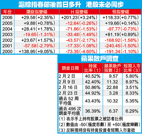 本報統計自千禧年春節後上海股市首日表現,7年中有5次紅盤高收,但恒指有4年下跌,H指更只有去年報捷,可見三者走勢並非同步。滙盈證券董事謝明光表示,長假期前人行突出招加存款準備金,明顯要為股市降溫,但估計實際成效及對股市衝擊有限,加上內地股民為打響頭炮,冀大牛市延續至豬年,相信首日可紅盤高開,但尾市升幅可能收窄。