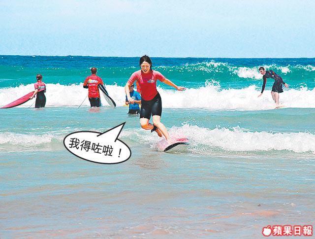 我不諳水性,但去到澳洲最著名兼歷史悠久的衝浪天堂—邦戴海灘(BondiBeach),就膽粗粗穿上wetsuit一齊去衝浪,誰知不玩還好,一玩就上癮!教練會由姿勢動作開始逐個step教,要衝浪首先要搵浪,浪在海邊對十幾米,要衝就要拿着板行出去,雖然自問並不嬌滴滴,途中還是會被浪衝返岸邊好幾米,路途認真「險阻」;見有大浪來,未上板就已經反,不知經歷幾多次失敗,以及喝了不知幾多口鹹到暈的海水之後,終於可以成功乘浪衝回岸,實在興奮,怎知不知從哪裏來了個無上裝金髮女郎,好彩我唔係男士,否則掛住昅,實浸死!我在試多好幾次之後,除了安全衝回岸之餘更可以站在板上—幾秒鐘咁多啦,但已開心到暈!成班友人只有我一人不諳水性,卻是第一個可以站在板上兼時間最長的一人,這件事情實在值得炫耀一番,哈哈哈!