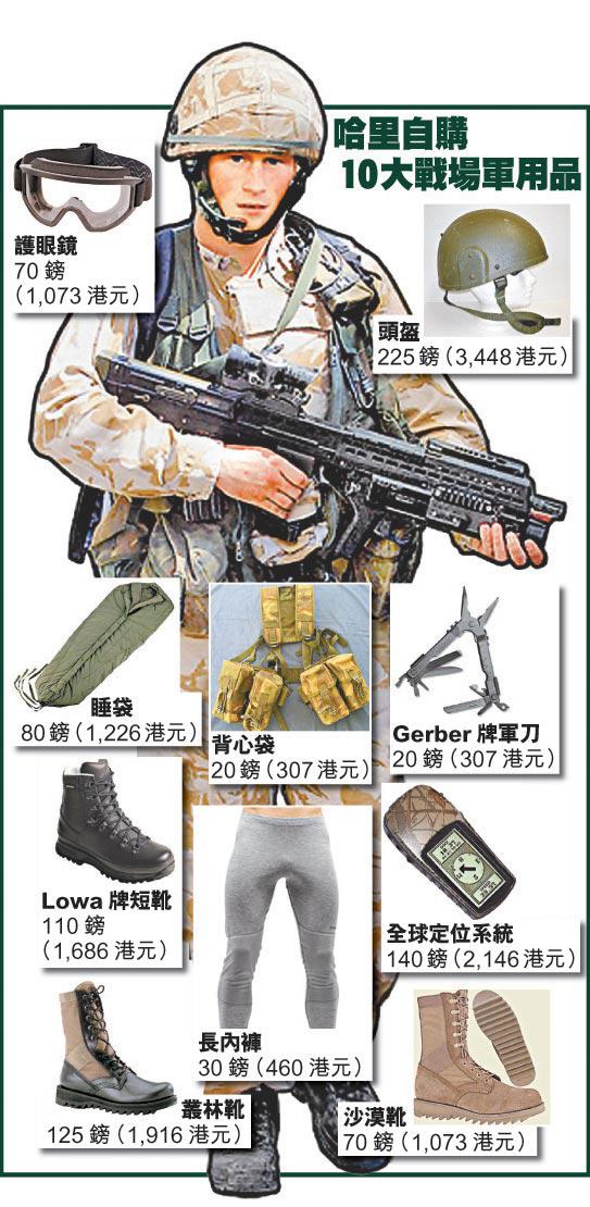 英國哈里王子(PrinceHarry)出征了,最快今年5月隨所屬的藍軍皇家騎兵團(TheBluesandRoyals)A裝甲營進駐伊拉克和伊朗接壤的米桑省(Maysan)。不過,英國國防部早有報道指,英軍裝備很爛,伊戰時甚至要挪走伊軍戰靴穿在腳上。因此,哈里上前線,必須自購軍備物資,軍靴、護眼鏡、睡袋、長內褲、全球定位系統等10大戰場軍用品,盛惠890英鎊(約13,600港元)。