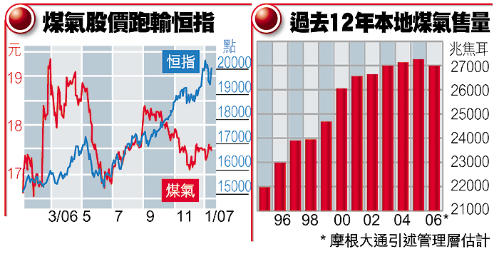 然而,內地撤銷接駁費之後,煤氣股價一直跑輸大市。煤氣上周五收報17.44元,與06年17元水平比較,7個多月僅升2.6%,遠遠跑輸恒指,其間恒指上升了29%(見附圖)。