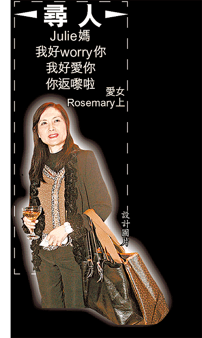 轉為地下情發展的混血名模Rosemary及男友Christopher,昨日情侶檔出席預祝元宵佳節活動,但Rosemary箍煲成功,阿媽Julie卻失蹤多天,她謂全家上下都聯絡不上母親,極度憂慮,Rosemary更公開呼籲尋母,真頭痕。Julie媽見字請回覆,家人掛念啊!