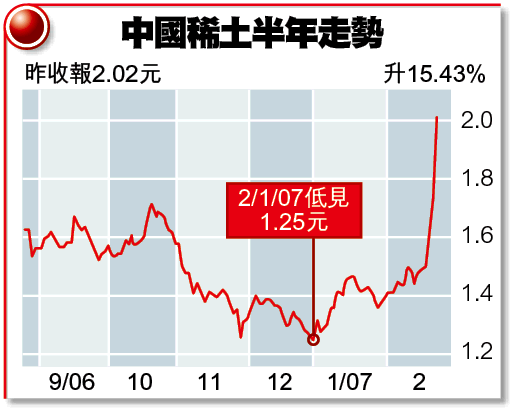 另外,發改委亦要求各廠加強環保及改善提煉技術,連同去年11月起對部份稀土產品加徵10%出口稅,中國稀土已把全部成本上漲轉嫁給客戶,料對盈利水平不會帶來影響。