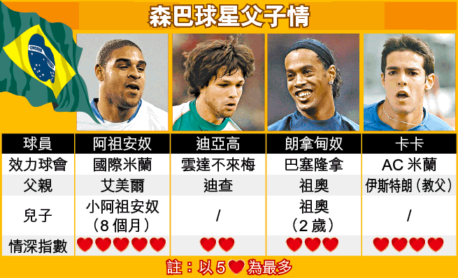廸亞高的父親廸查月前開電單車追着妻子的情人追打,令廸亞高十分失落;天主教徒的卡卡對教父、教母很敬愛,兩人早前因攜帶來歷不明的現金被美國警方拘捕,該球星一度絕食祈求對方平安。