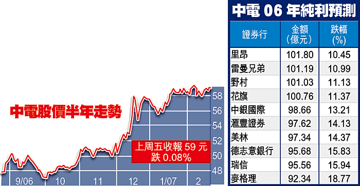 雷曼兄弟估計,中電06年全年純利倒退10.99%至101.19億元。該行維持看淡香港公用股,並指中電絕對有可能不獲批興建天然氣儲存庫,更認為現時股價並未反映日後准許回報有可能因排放未能達標而下降的風險,因而給予「跑輸大市」評級,目標價45.2元。