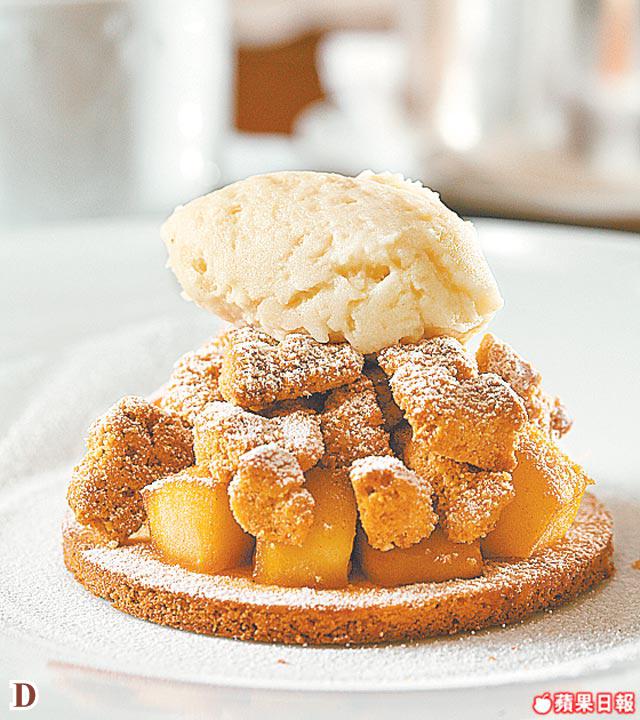 師傅先將蘋果用牛油炒香,然後加入糖再炒至變金黃色,最後就加入牛油粒,放在SableBreton脆餅上入爐再焗。AppleCrumble入口好重牛油味,咬落又香脆。