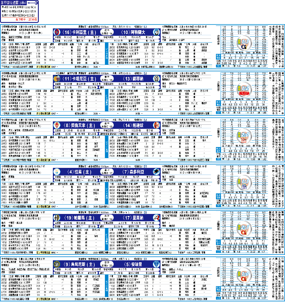 費倫天拿上仗作客失分於里賈納腳下,而今季作客失分後翌仗返回主場必勝,周日迎擊拖連奴穩贏,宜以2.1倍「主勝」作膽,拖森多利亞「客勝」及卡利亞里和波,3串4全中有27倍。