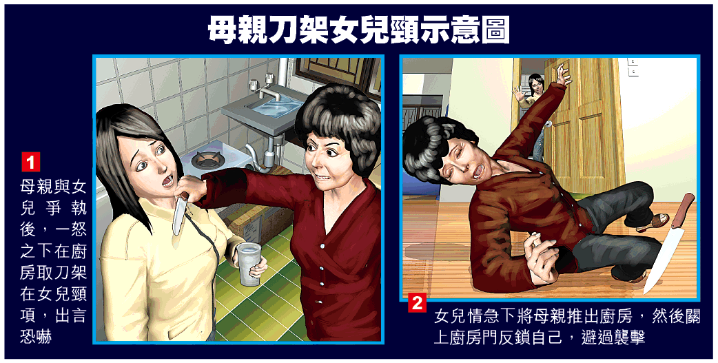 【本報訊】馬鞍山與秀茂坪昨日分別發生家庭暴力事件,一名母親因為金錢問題與女兒爭執,其間情緒激動取出利刀,架在女兒頸項,出言恐嚇,幸女兒及時將母推開,將自己反鎖廚房內躲避,避過血光之災,涉案母親事後棄刀離家,其後自行到警署自首;另一名七旬父親則因為與女兒爭用廚房發生口角,其間父親竟拿起鐵鎚企圖向女兒施襲,幸母親及時營救,結果一家三口混戰同告受傷。 記者:文兆麟 譚健文