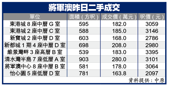 譚桂貞說,將軍澳多個地鐵站沿線屋苑,備受上車客追捧,東港城昨單日有兩宗成交,其中8座中層G室,595方呎,獲用家以182萬元買入,呎價3059元。另將軍澳中心8座中層B室,581方呎,以178萬元售出,呎價3064元。