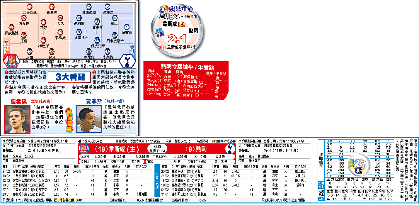 「讓球」熱刺讓平/半,觀乎他們今屆讓平/半盤路是1贏4輸(見附表),再加上上述的不利因素,一於博韋斯咸下盤。波膽則可考慮韋斯咸勝2:1或打和1:1。