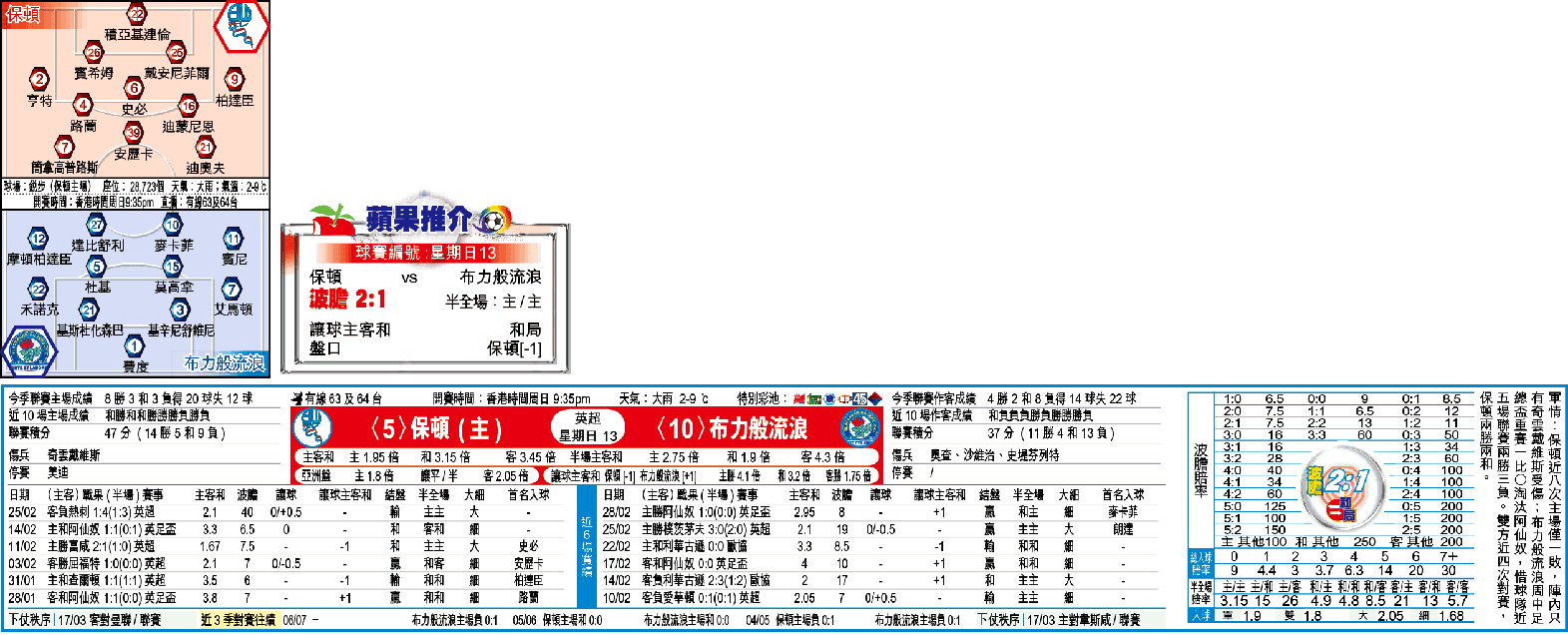 保頓有賓希姆復出,球迷不用擔心他們會重蹈大敗覆轍,但兩軍打法接近,難有「大」手交易,一於吼保頓「細」兼「讓球主客和」的「和局」。