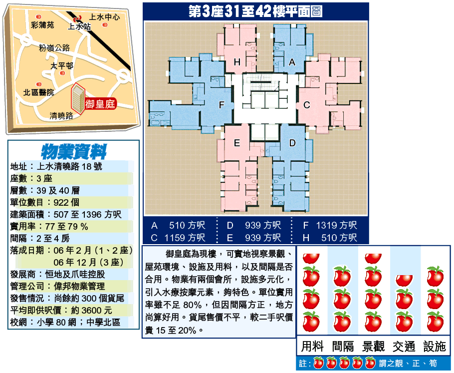 御皇庭鄰近上水北區醫院及太平邨,規模不大,共922伙,戶戶有露台,分兩期建成,第1、2座是第1期,去年初入伙,第3座為第2期,去年底落成。