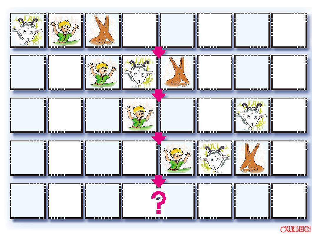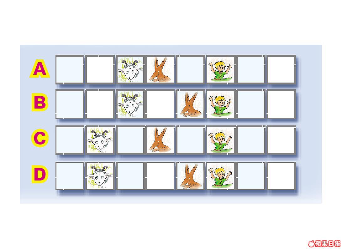 小王子在飛機師手中得到一幅畫着盒子的圖畫,想像着盒內有他最心愛的綿羊。亦在自己馴養的狐狸口中知道︰「最珍貴的東西是不能用肉眼看見的,而是用心靈感受的!」請依據下列圖案的排列及移動方式,推斷出最後一行的排列方法,並在A~D內選出正確答案。