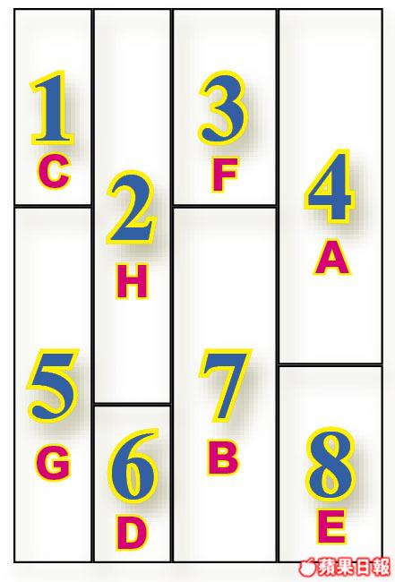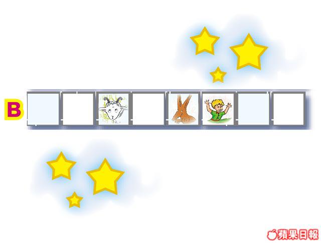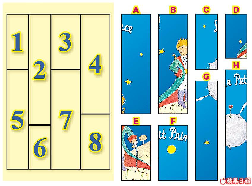 小王子拜訪過不同的星球,遇上以為統治一切的國王、流落沙漠的飛機師、不斷喝酒的醉酒鬼、貪心的商人、固執的點燈人、喜愛被人讚美的虛榮者、愛看書的地理家,以及希望被馴養的狐狸。請將A~H的圖塊拼回1~8的正確位置內。