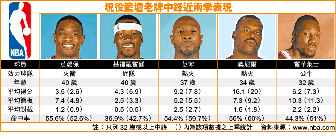 莫欺「老」年窮!上周五聯盟兩大老將熱火的奧尼爾,以及火箭的莫湯保大發神威,帶領球隊殺敗強敵,齊將久違了的中鋒霸氣重現球壇!