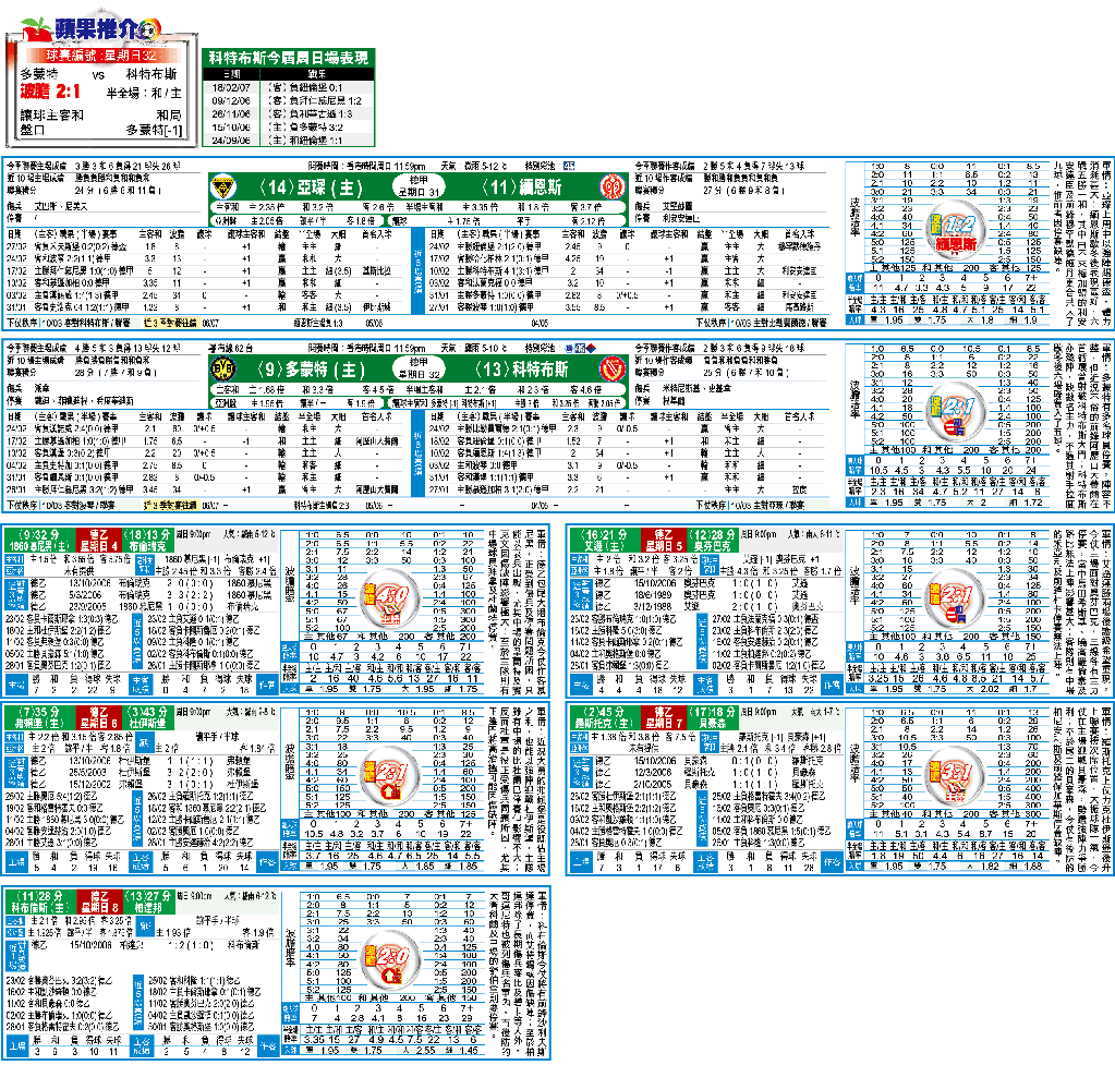 畢竟,科特布斯同樣殘陣,後衞米特尼斯基及中場史基拿因傷缺陣,而中場根基爾則要坐波監;加上他們今屆聯賽作客表現麻麻,僅2勝3和6負,在今屆在周日表現又令人失望,只得1和4負(見附表),而且踢法單調;因此,今役就算受讓,亦不值博。