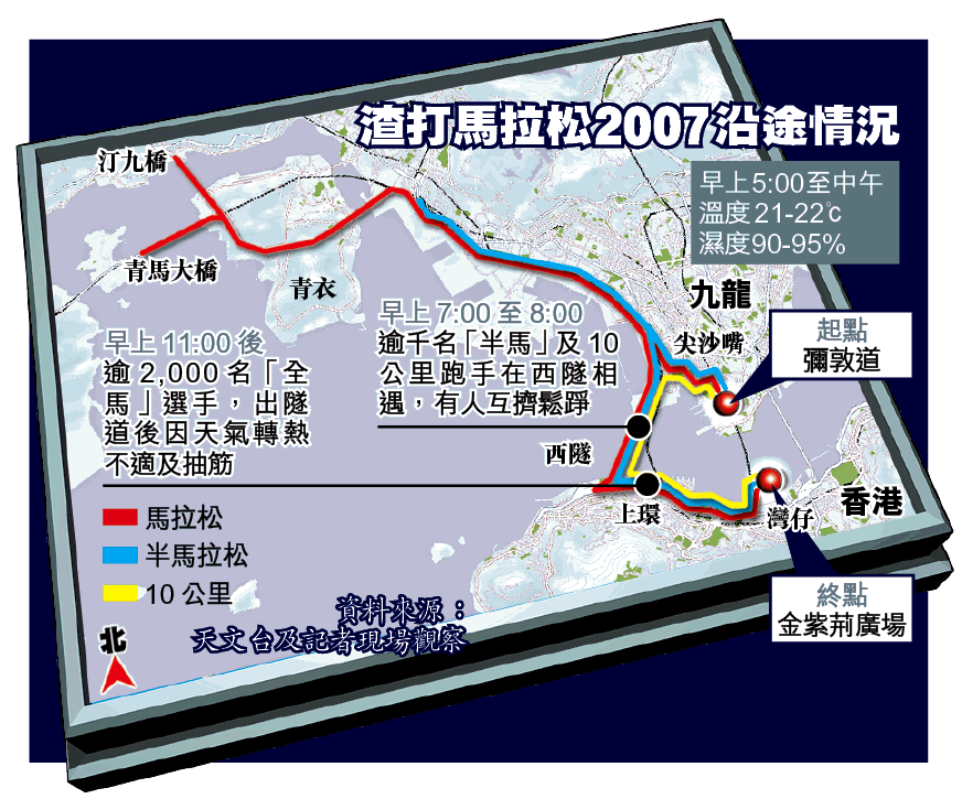 天文台表示,昨早5時至中午前的馬拉松比賽時段,濕度維持90至95%,溫度則介乎攝氏21至22度。37,438名落場比賽的長氣袋,雖然氣呼呼兼大汗淋漓、堅持跑畢全程,但也有6,200多名跑手不適、抽筋、有水泡、需要包紮傷口及冰敷等,由醫療輔助隊協助,無緣見到終點。