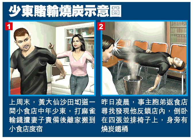 【本報訊】黃大仙沙田㘭道一間小食店的中年少東,因為打麻雀輸錢遭妻子責備後,發脾氣離家出走搬到小食店度宿。昨凌晨被胞弟發現反鎖店內燒炭自殺,報警求助將他送院搶救,目前情況嚴重。 記者:潘志能