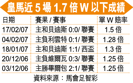 簡評:皇馬近期開W盤路奇特,賠率在1.9倍或以上先識贏,反而被看好及單W賠率在1.7倍以下時,則通常未能勝出,近5場僅得1勝2和2負。今晚對基達菲亦剛好在1.65倍水位,信盤路可吼2.1倍「客勝」。文:畢傑