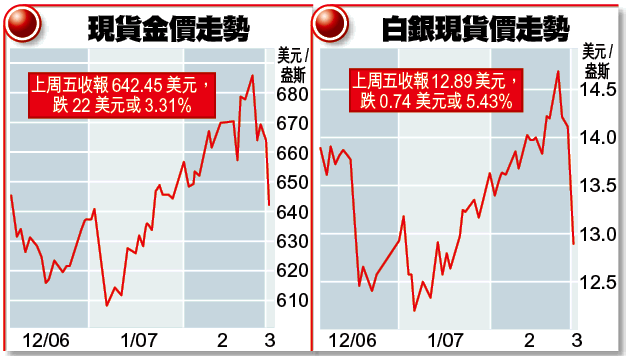 現貨金和白銀現貨上周五分別跌3.31%和5.43%,收報每盎斯642.45美元和12.89美元,白銀全周跌幅更達11%。其他主要基本金屬則因為憂慮中國需求放緩,亦全線下挫。