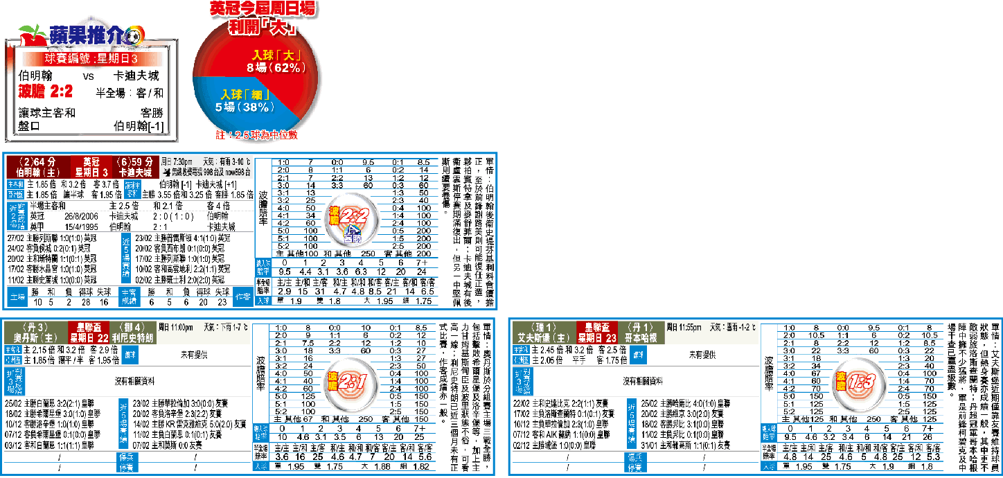 伯明翰於周日的英冠聯獨腳迎卡廸夫城時,當然希望勝出重奪榜首位置;不過,曾在季初於榜首放領的卡廸夫城實力不俗,加上伯明翰未能「夫添」,且今屆周日英冠聯賽事頗利入球「大」,是役首選為入球開「大」,再補受讓一球的卡廸夫城「客勝」。(球賽編號:星期日3;無綫收費電視998台及now898台今日7:30pm直播)