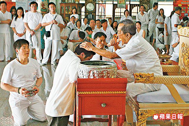 林建岳和林孝賢進廟後,也跟其他信眾一樣,誠心跪地參拜白龍王,其後白龍王為他們祈福時,先以朱砂在他們額上蓋印,再拿一堆燃點中的白蠟燭在他們頭上繞圈,最後放進自己口中含熄後,將煙霧噴向林建岳父子。