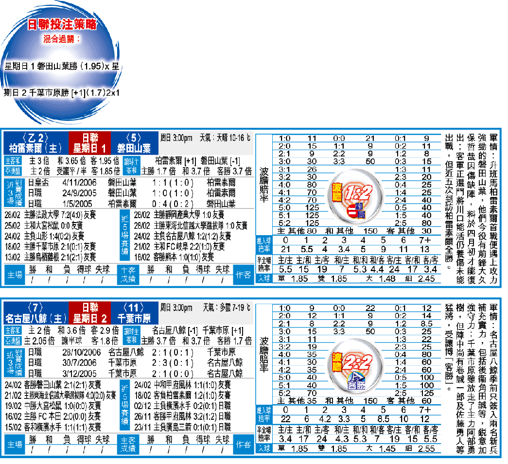 周日兩場日聯揀選兩支客隊揚威,磐田山葉到訪升班馬柏雷素爾開單W唔難,串千葉巿原作客名古屋八鯨不敗,開受讓一球的「客勝」,混合2串1有3.3倍。