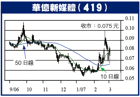 華億新媒體(419)主打祖國多媒體業,純利係斷倍計,兼且係最平嘅媒體股,有權翻一番。華億主打祖國電影電視製作,兼撈埋廣告代理及衞星電視,06年度中期(6月止)純利暴升42倍到2.5億銀。就算扣除營運以外嘅一次性收益,集團嚟自廣告、電視、電影製作嘅申報溢利,講緊9150萬銀。君真啲以核心業務計數,估計華億全年度純利1.4億銀,現價7.5仙,PE得6.8倍。近磅股鳳凰衛視(8002)預期PE30倍、勤+緣(2366)都講緊10倍,華億又係平通街。