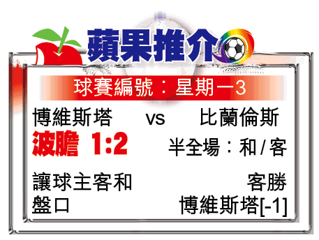 今晚深夜上演的葡超獨腳戲,由剛於葡萄牙盃出局的博維斯塔主場迎戰比蘭倫斯,礙於主隊今仗受傷兵問題困擾,加上又有中場主力坐波監,「讓球主客和」宜捧受讓的「客勝」,有信心者更可冷敲比蘭倫斯3.6倍單W!(球賽編號:星期一3;香港時間明日3:45am開賽)