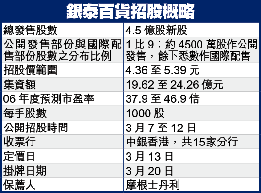 招股書披露,銀泰在浙江經營5家百貨店,由於其中2家是05年啓業,另外2家於今年初才開業,因此於98年開業的杭州分店是集團主要收入來源。05年度及截至06年9月止9個月,杭州分店收入分別佔總營業額80.2%及63.4%。集團亦持有3家A股上市公司之少數權益。