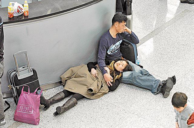 滯留瀋陽桃仙機場的旅客在機場睡着了。 新華社