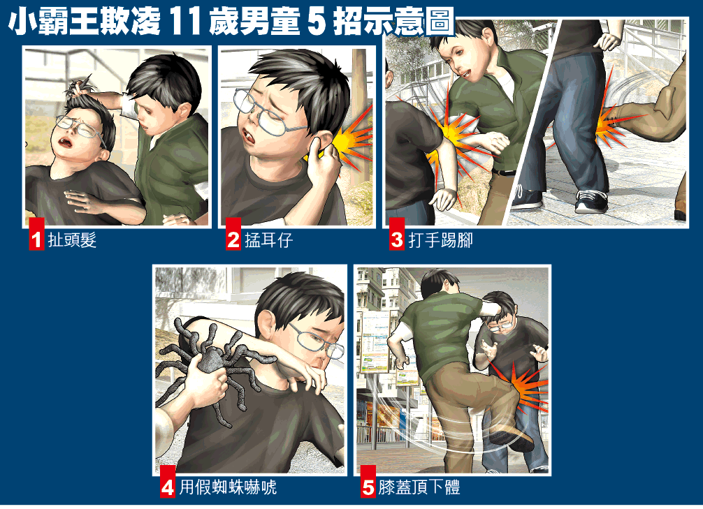 【本報訊】一名11歲小六男生過去半年在旺角的補習社內,不斷遭另一名比他小一歲的「小霸王」欺凌,包括扯頭髮、掹耳、踢腳、用假蜘蛛嚇唬等。前晚事主因為不肯陪小霸王等車又再捱打,並遭對方用膝蓋狂頂下體5、6次。事主下體紅腫痛楚向父親哭訴,至昨晨到警署報案。記者:梁偉權