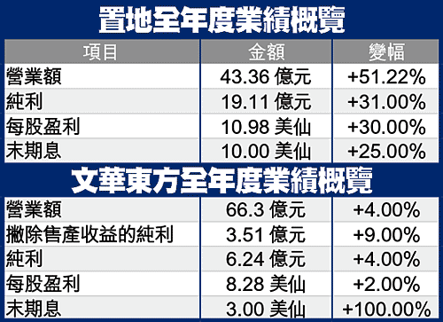 置地控股昨日公布截至去年12月底止業績,全年基本純利增長31%,達19.11億元(2.45億美元);而同系經營酒店的文華東方去年完成出售一間紐約酒店的部份股權獲特殊收益,全年賺6.24億元,升4%。