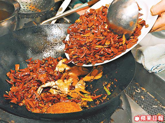 材料:肉蟹1斤、花椒1/2両、辣椒亁1斤、蝦醬/蜆蚧/蝦米茸各1湯匙、薑片/葱/生粉/鹽/麻油/辣椒油/荔枝醋各少許、油適量